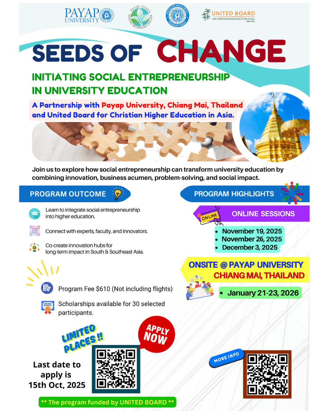 The United Board for Christian Higher Education in Asia, in collaboration with Payap University, invites applications for the Social Entrepreneurship Program for Faculty in Asia. This program is designed to empower faculty leaders across Asia by cultivating entrepreneurial thinking, equipping educators with practical tools for social impact, and fostering cross-cultural collaboration among institutions committed to holistic education.